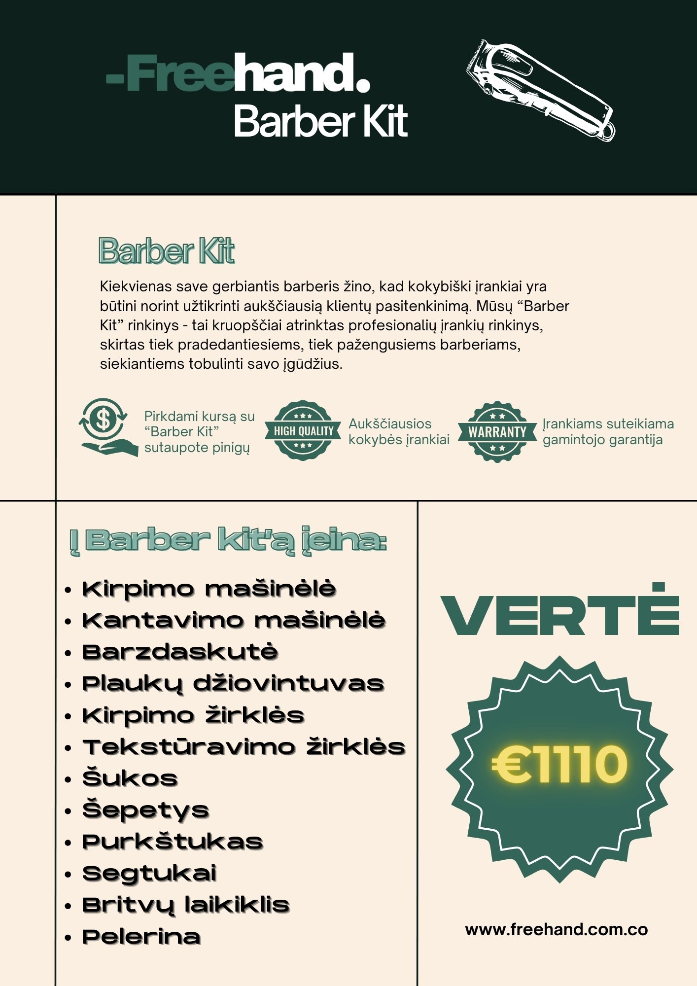 - Kursą veda patyrusi ir profesionali barberių komanda.